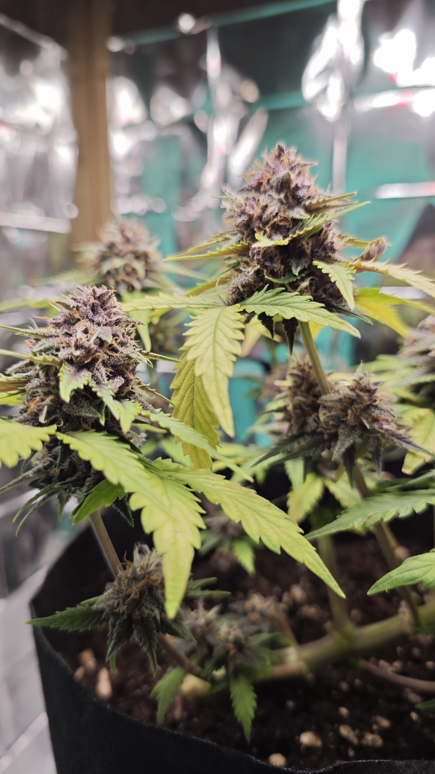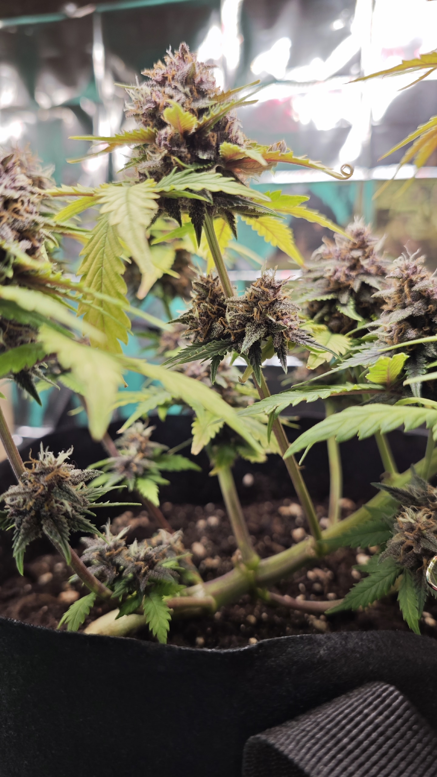 Начало девятой недели выглядит воодущевляюще. Шишечки подросли, листва стала меньше желтеть. Вид у нее все равно нездоровый - на паре листов пятна, а сами листья бледно-зеленые, но хотя бы не сохнут и не отваливаются. На 8 неделе было 2 полива по 2 литра. Компотик: На 1 л: гр 3 мл + блум 3 мл + топмакс 1 мл + калмаг 0,8 мл. И водичка с калмагом. ПШ всегда 6,5. На данный момент пользуюсь лакмусовыми полосками для определения пш.