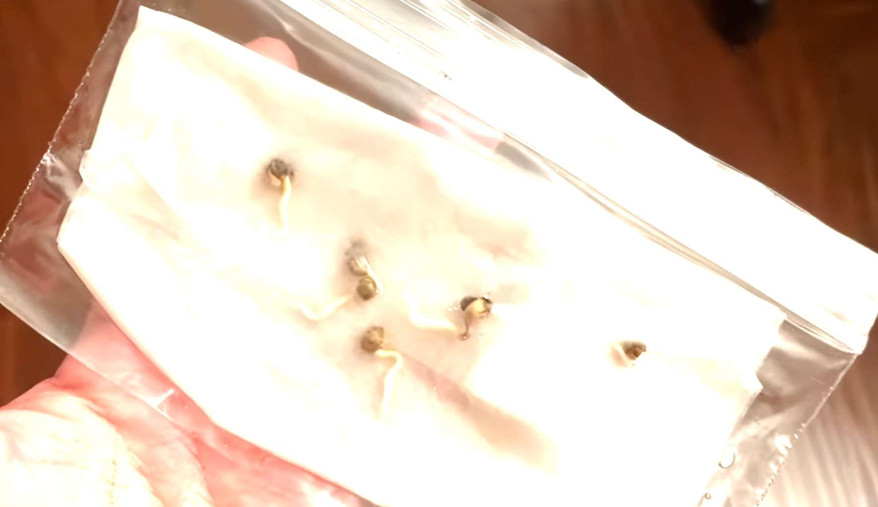 И вот, мы начинаем!) Берем нашу семечку, берем стопочку, наливаем в стопочку водичку теплую, в водичку капаем примерно 5 капель перекиси водорода 3% и столько же капель жидкого биогумуса. Кидаем семечку в стопочку и убираем стопочку в теплое, темное место. Ждем 12-24 часа. Через 12 часов наша семечка утонула, поэтому помещаем ее между двумя влажными ватными дисками, кладем в зип-пакет, дышим в него, как не в себя, закрываем. И убираем в темное, теплое место.